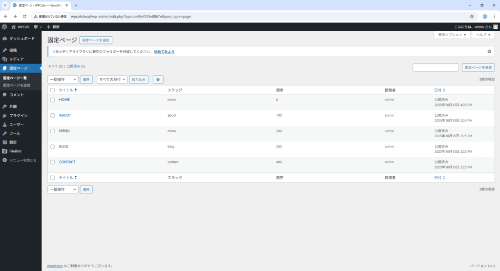 の固定ページを作成まだ機能は最小限ですが、サイトの骨組みができました。次回からは、ナビゲーションメニューを実装し、ページ間をスムーズに移動できるようにしていきます。